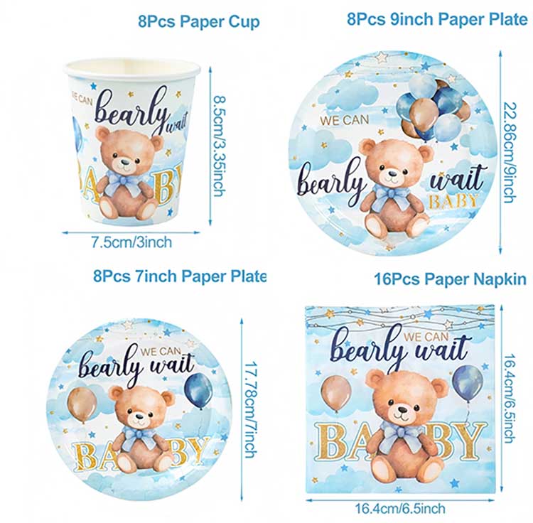 Kích thước bộ đĩa dùng một lần sinh nhật cho bé: Sản phẩm được đóng gói trong túi OPP, nhưng cũng có sẵn bao bì thẻ giấy. Chúng tôi có thể tùy chỉnh bao bì theo yêu cầu cụ thể của khách hàng.