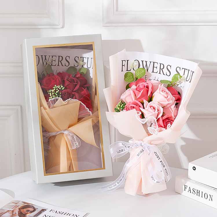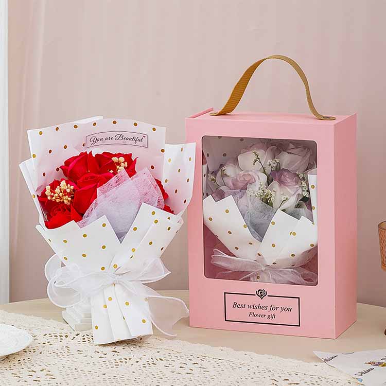 Hộp quà tặng bó hoa được dập nóng, viền trong suốt và chất liệu dập nổi, có thể làm cho những bông hoa trở nên nhiều lớp và cao cấp hơn. Chất liệu được sử dụng là bìa cứng, cán màng và các vật liệu thân thiện với môi trường, có tác dụng chống áp lực và chống biến dạng. Trong bất kỳ lễ hội nào, khách hàng có thể mua hàng theo nhu cầu, rất tiết kiệm chi phí.
