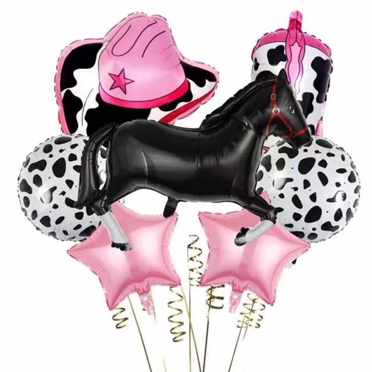 Với các đường viền và màu sắc chính xác, chúng khôi phục các đường viền cơ và bờm bồng bềnh của những con ngựa đang chạy, đồng thời các phối màu tự nhiên phổ biến như nâu và đen phù hợp hơn với hình ảnh thật của những con ngựa. Một số bóng bay bằng giấy bạc theo chủ đề cao bồi thậm chí còn thêm các màu kim loại như bạc và vàng để tăng tác động thị giác; Họa tiết con bò có hình tròn, in hoa văn con bò đen trắng trên đó, một số kiểu có thêm một số đồ trang trí ba chiều như chuông nhỏ và plu.Đuôi chữ sh bên dưới những quả bóng bay bằng lá nhôm vừa dễ thương, vừa mang phong cách nông thôn, là chủ đề rất được yêu thích trong các hoạt động cao bồi dành cho gia đình.