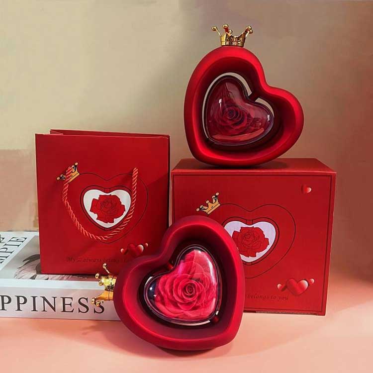 Hộp trang sức hoa hồng hình trái tim sử dụng hoa được bảo quản loại A, có màu sắc và kết cấu không thể phân biệt được với hoa tươi.