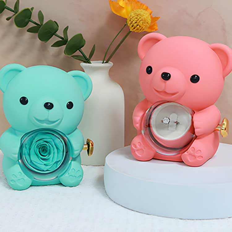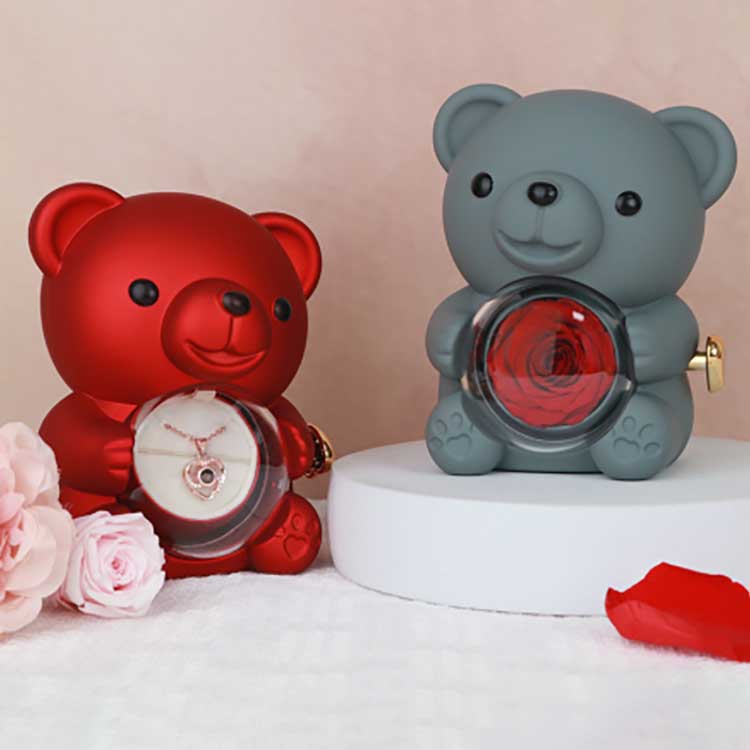 Hộp trang sức Hug Bear Rose này được sử dụng để trưng bày trên bàn làm việc, giá sách hoặc bàn cạnh giường ngủ. Đặc điểm bắt mắt nhất của nó là bông hoa hồng được bảo quản ở trung tâm. Mở bông hồng ra sẽ thấy một ngăn để đựng đồ trang sức, nhẫn hoặc đồ lưu niệm.