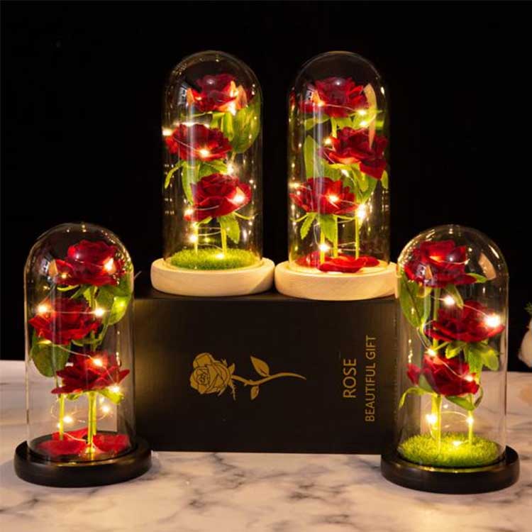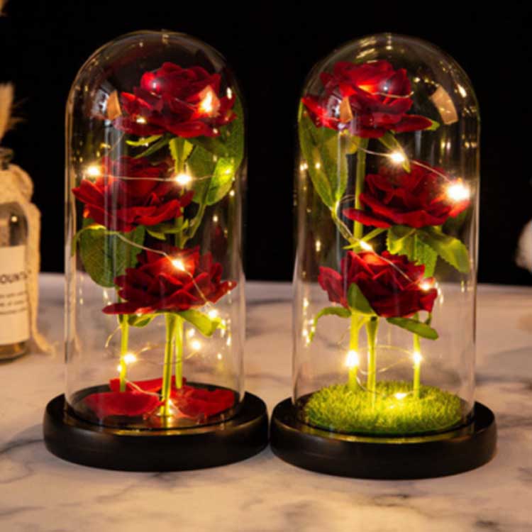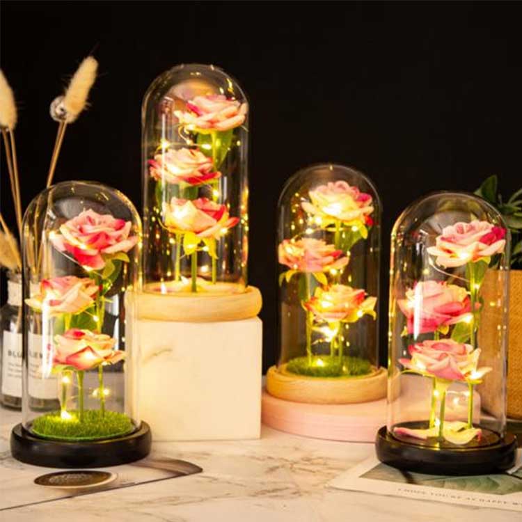 Bên trong mái vòm kính hoa hồng là ba bông hoa được bảo quản ở các độ cao khác nhau, có thân và lá xanh như thật. Vỏ kính chịu nhiệt và không dễ bị hư hỏng. Đèn dây LED tích hợp ánh sáng dịu và công tắc nằm dưới đế gỗ để dễ dàng thao tác. Thích hợp để sử dụng trong trang trí đám cưới và nội thất gia đình, đồng thời cũng có thể được tặng làm quà kỷ niệm hoặc quà sinh nhật. Bộ sản phẩm bao gồm một mái vòm kính tối giản và một thẻ quà tặng có thể tùy chỉnh.