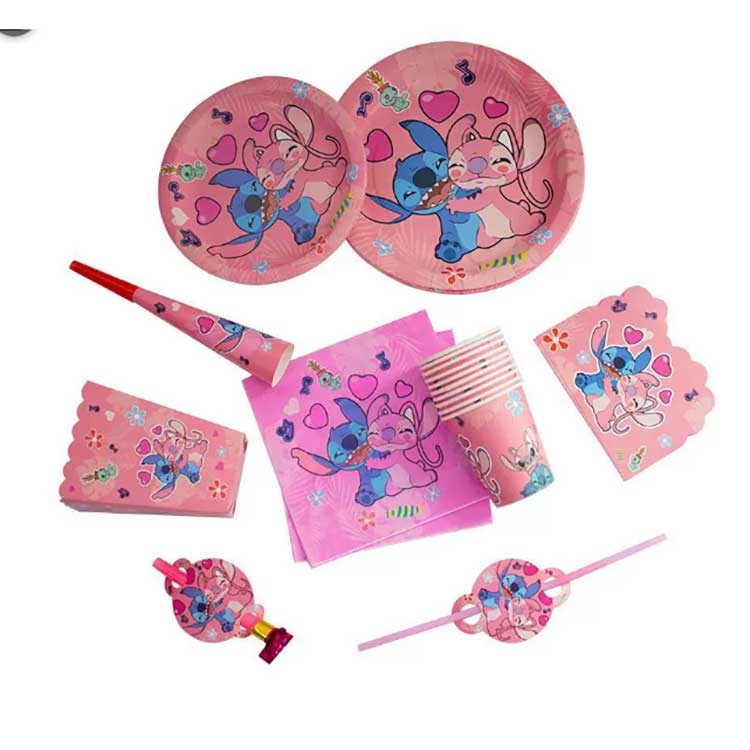 Bộ đĩa dùng một lần Stitch bao gồm các sản phẩm sau: đĩa 7 inch (10 cái/túi), đĩa 9 inch (10 cái/túi), khăn ăn (20 cái/túi), cờ hiệu (10 cái/túi), túi quà trả lại (10 cái/túi), hộp bỏng ngô (6 cái/túi), rồng thổi (6 cái/túi), mũ giấy (6 cái/túi), cốc giấy (10 cái/túi), sừng (6 cái/túi), ống hút (10 cái/túi), thiệp mời (10 cái/túi), khẩu trang (10 cái/túi), thìa, dao kéo (10 cái/túi) và khăn trải bàn (1 cái/túi). Bộ sản phẩm gồm 17 loại sản phẩm khác nhau. Khách hàng có thể lựa chọn mua cả bộ hoặc chỉ chọn một phần sản phẩm để đáp ứng nhu cầu của mình.