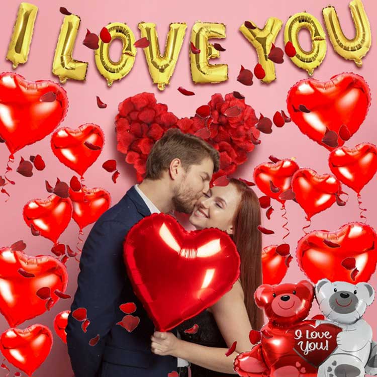Bong bóng lá ngày lễ tình nhân có những khẩu hiệu ngọt ngào như "Anh yêu em" và "Ngày lễ tình nhân vui vẻ". Những quả bóng bay có màu đỏ, hồng và vàng rực rỡ, tạo ra hiệu ứng ba chiều khi được thổi phồng lên. Nhìn bề ngoài, nó mang đến một bầu không khí lễ hội lãng mạn. Ngoài khẩu hiệu, chúng còn có nhiều hình dạng khác nhau, chẳng hạn như hoa hồng, gấu ôm trái tim và đôi môi, cùng nhiều hình dạng khác. Bạn có thể chọn dựa trên bối cảnh và phong cách cụ thể.